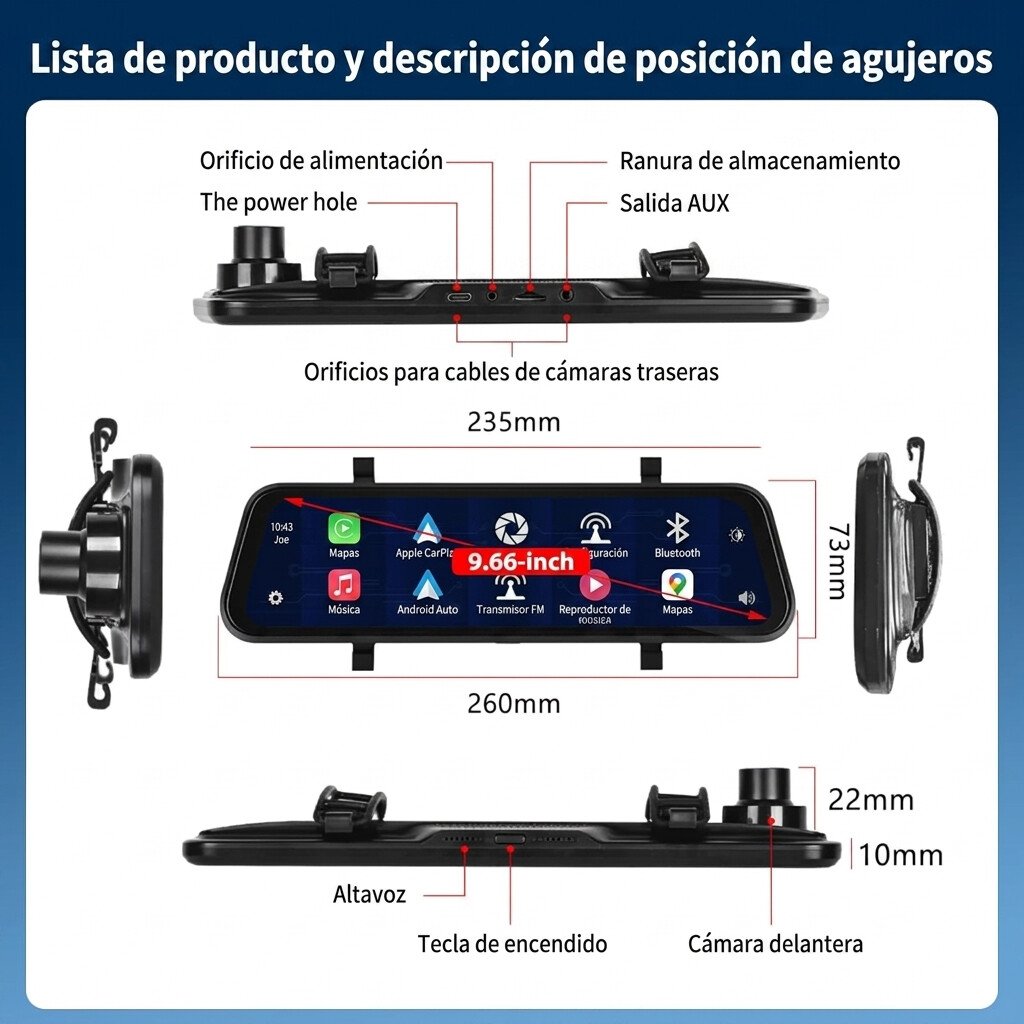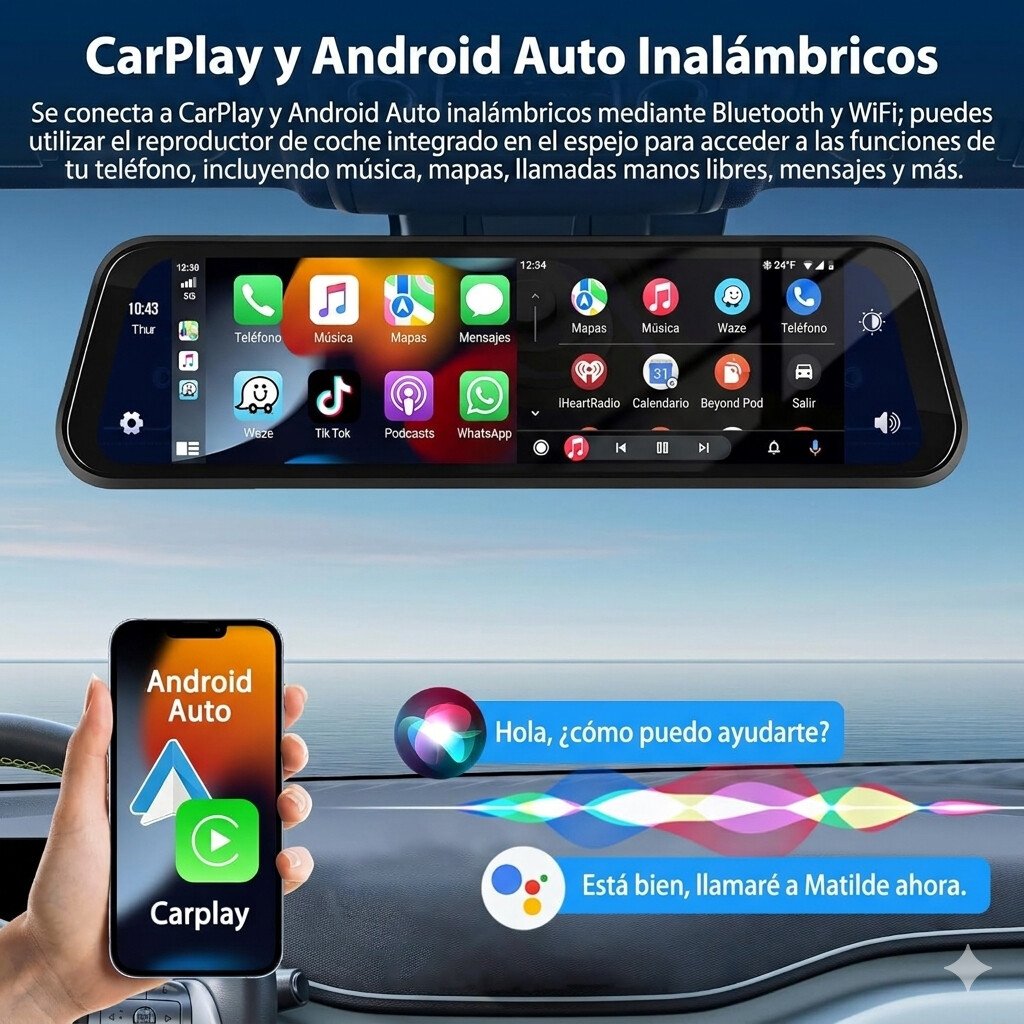 Espejo con Retrovisor + Carplay 9.66” Full HD que *incluye cámara delantera y trasera en 1080P, equipada con tecnología WDR y visión nocturna para imágenes claras en cualquier condición. Cuenta con ángulo amplio de hasta 170° que reduce puntos ciegos, además de CarPlay y Android Auto inalámbrico para usar GPS, música y llamadas sin cables. Incluye control por voz, pantalla táctil, grabación en bucle, asistencia de reversa, y conexión por Bluetooth y FM para reproducir audio en tu vehículo. Requiere tarjeta de memoria (TF/microSD) para almacenar las grabaciones. Todo lo que necesitás para una conducción más segura, moderna y cómoda.